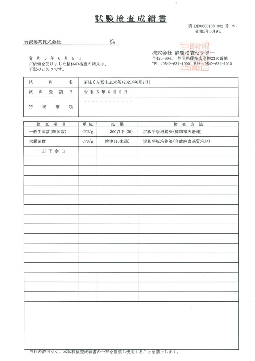 2023.06.14|品質管理 2023年粉末緑茶・粉末玄米茶 菌検査成績表 2023年の粉末緑茶・粉末玄米茶の菌検査成績表です。 この記事をシェアする ツイート シェア 送る 次の記事 一覧へ戻る 前の記事
